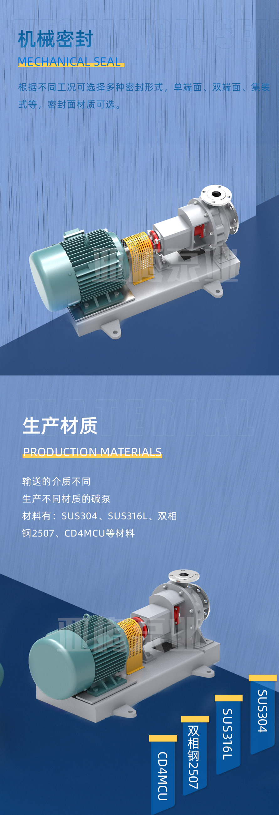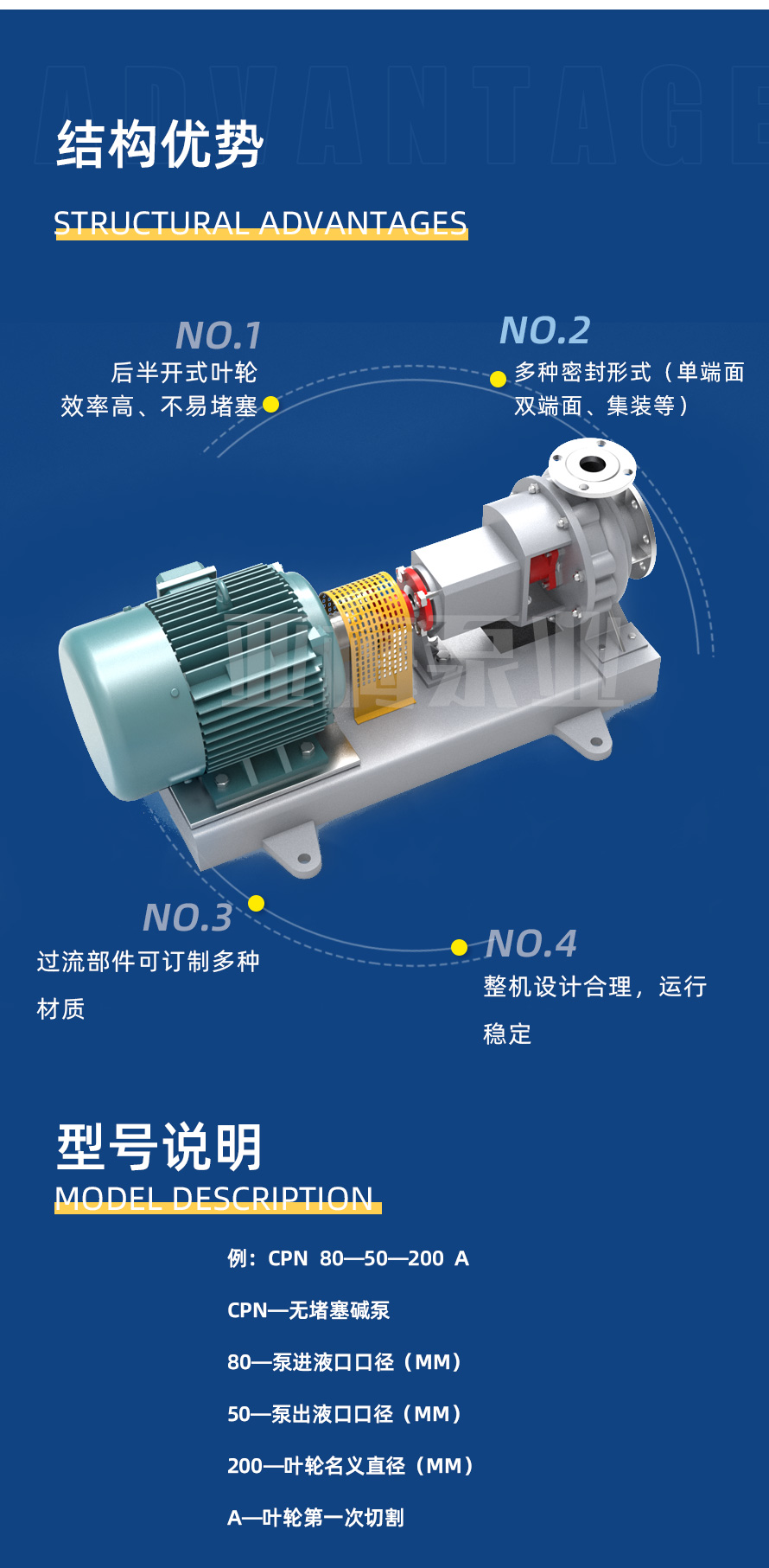 CPN型堿泵葉輪為后半開式結(jié)構(gòu),不易堵塞,效率高,運轉(zhuǎn)時產(chǎn)生負(fù)壓。配備雙端面或單端面密封,可輸送含有固體顆粒,易結(jié)晶的介質(zhì)。該型泵可耐150℃高溫,使用時需加冷卻水。