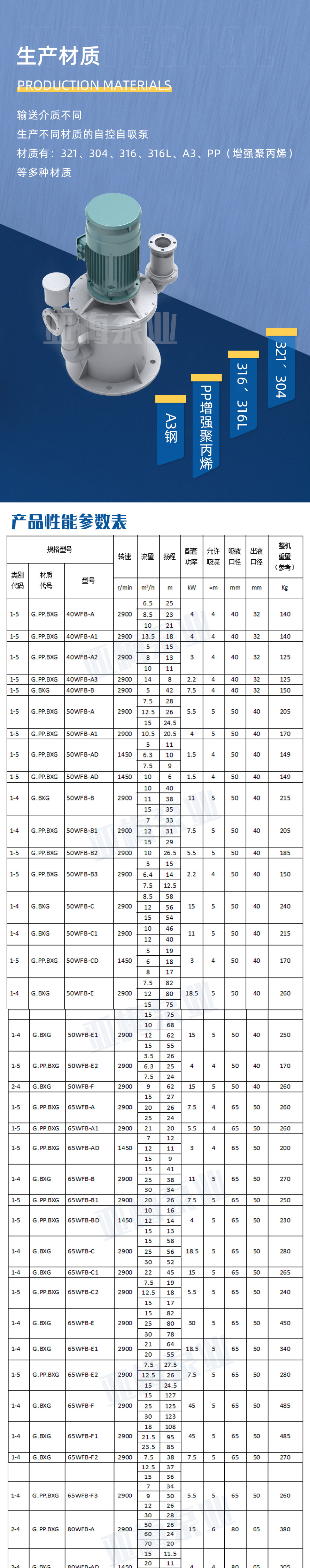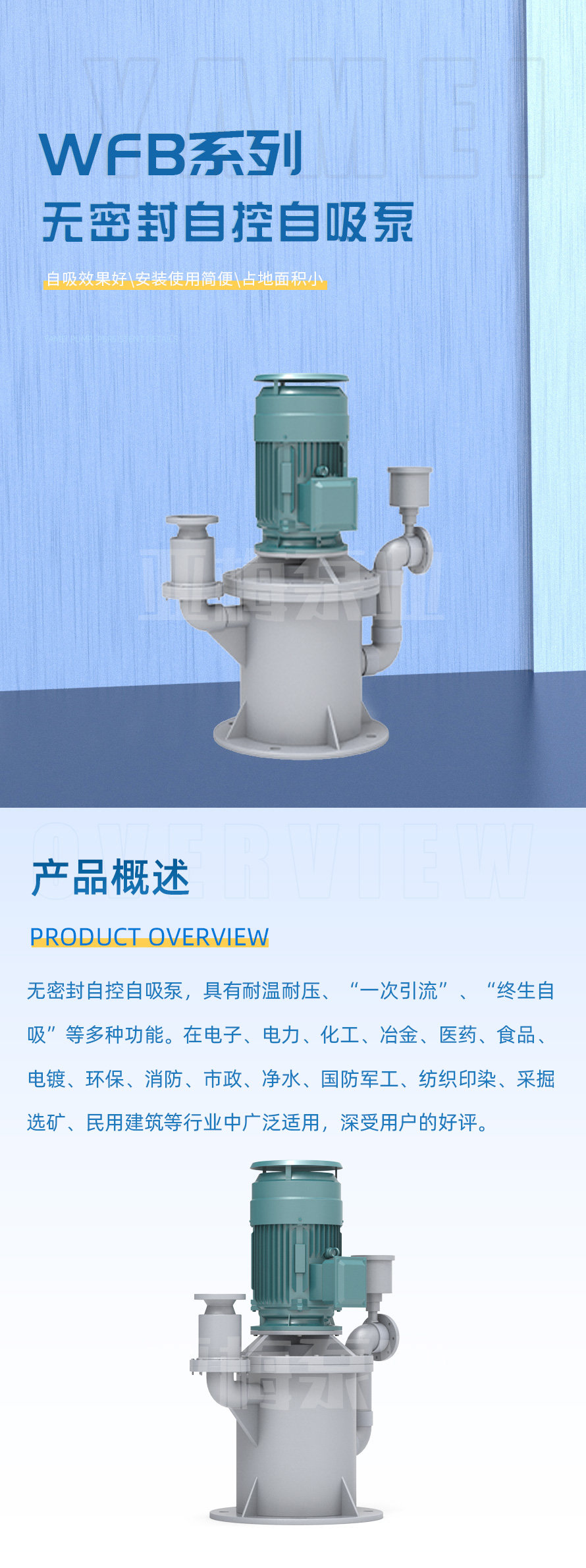 WFB系列無密封自控自吸泵,具有耐溫耐壓、“一次引流”、“終生自吸”等多種功能。目前生產321、304、316、316L、A3、PP(增強聚丙烯)等多種材質的系列整機,五種不同造型共一千余種規格。在電子、電力、化工、冶金、醫藥、食品、電鍍、環保、消防、市政、凈水、國防軍工、紡織印染、采掘選礦、民用建筑等行業中廣泛適用,深受用戶的好評。