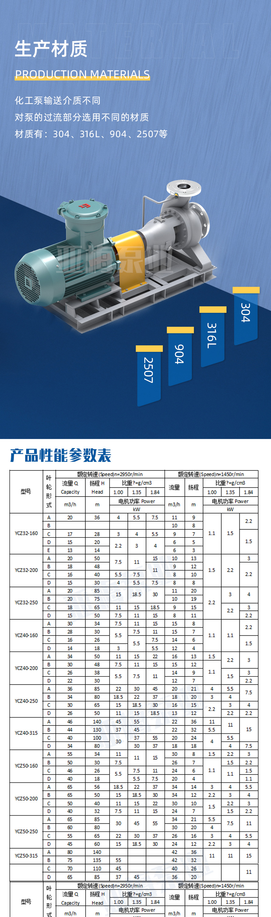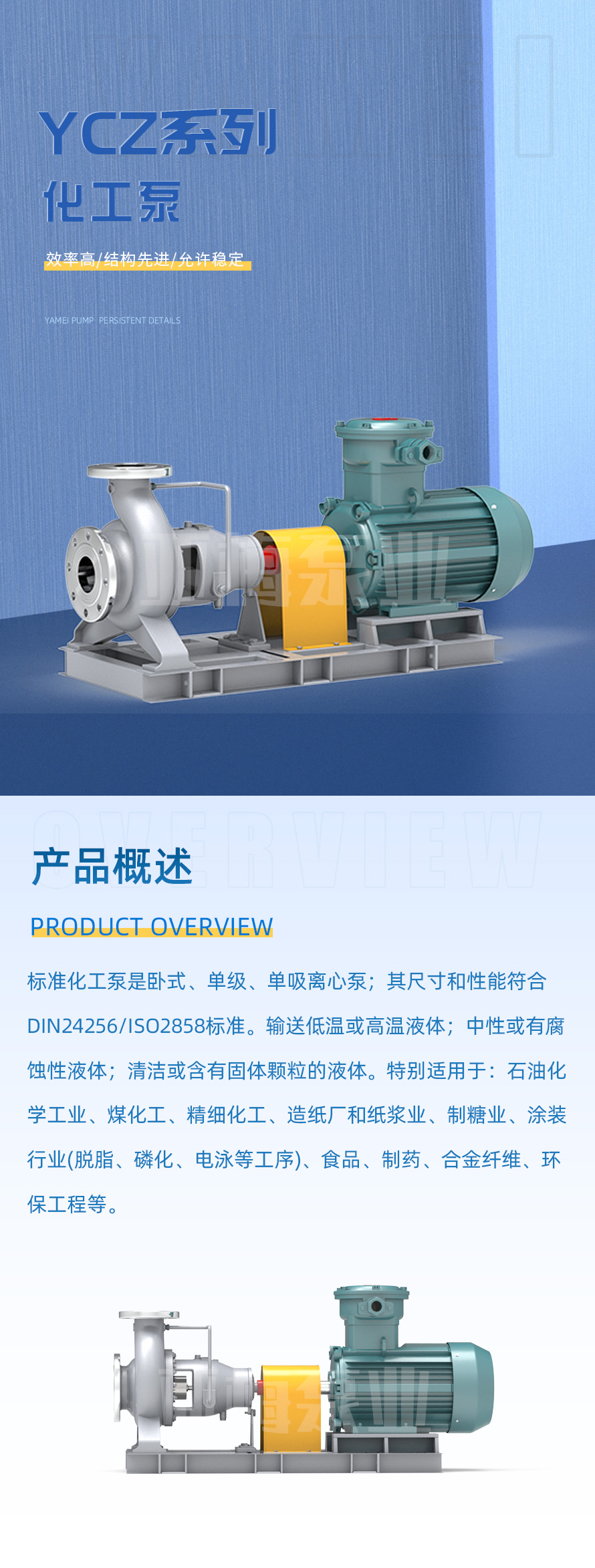 YCZ系列標準化工泵是臥式、單級、單吸離心泵;其尺寸和性能符合DIN24256/ISO2858標準。 YCZ系列標準化工泵的性能范圍包括了IH系列標準化工泵所有性能,其效率、汽蝕性能等指標均超過IH型泵。