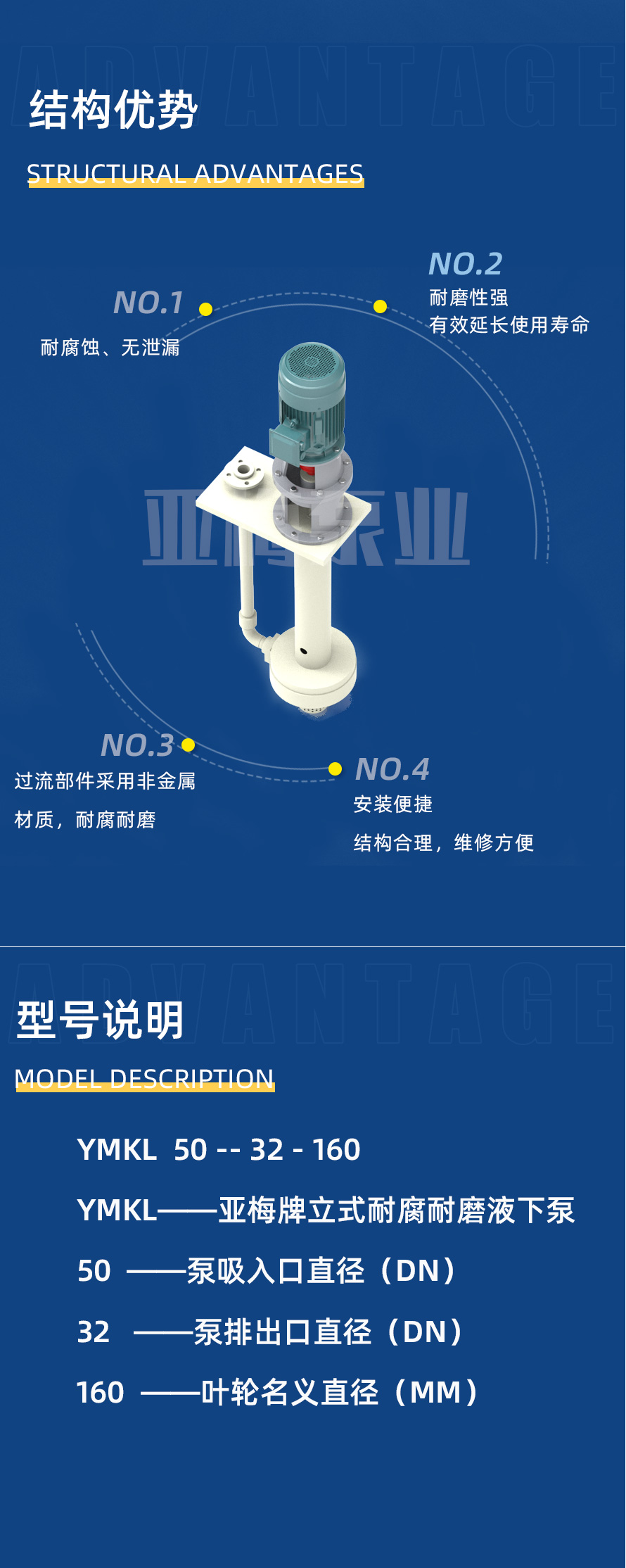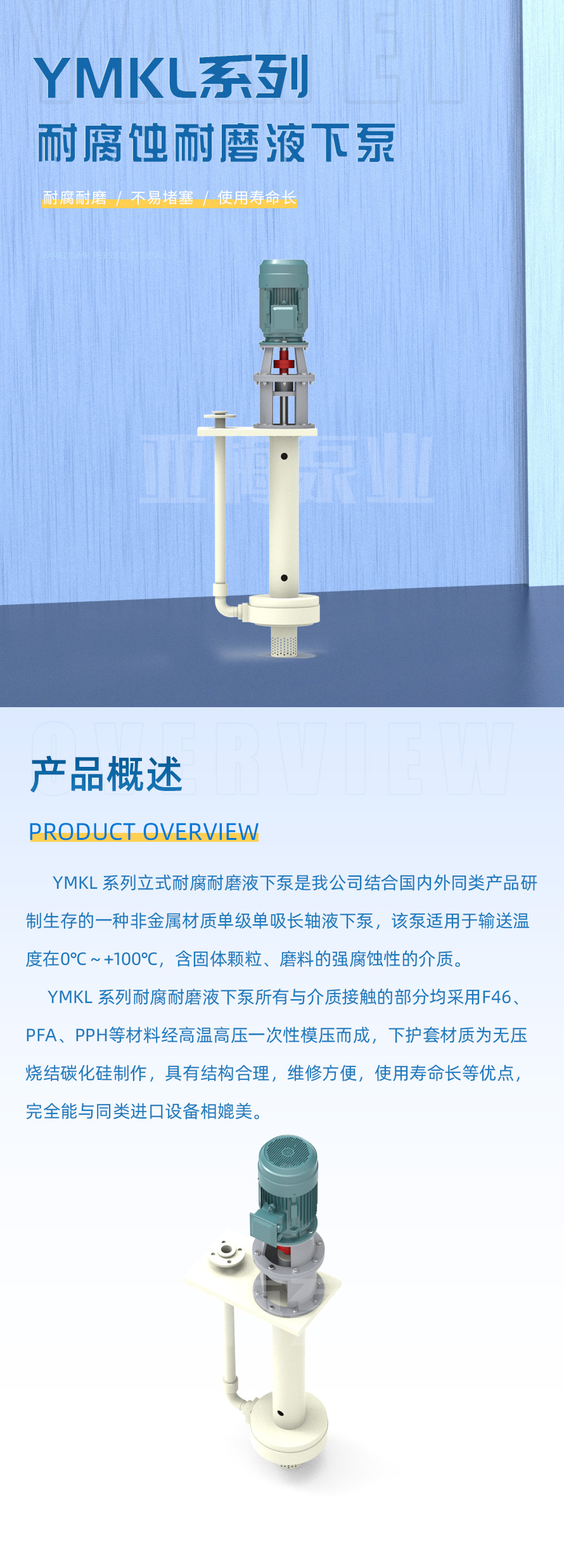 YMKL 系列立式耐腐耐磨液下泵是我公司結(jié)合國內(nèi)外同類產(chǎn)品研制生存的一種非金屬材質(zhì)單級單吸長軸液下泵,該泵適用于輸送溫度在0℃~+100℃,含固體顆粒、磨料的強腐蝕性的介質(zhì)。